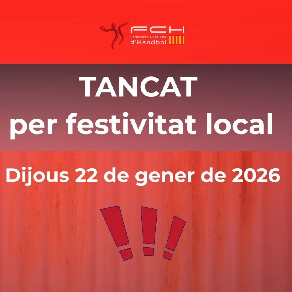 Aquest dijous 22 de gener de 2026 la Federació Catalana d’Handbol restarà tancada per festivitat local.   Tornarem a estar operatius el divendres 23 de gener de 2026.   Gràcies per la vostra col·laboració!