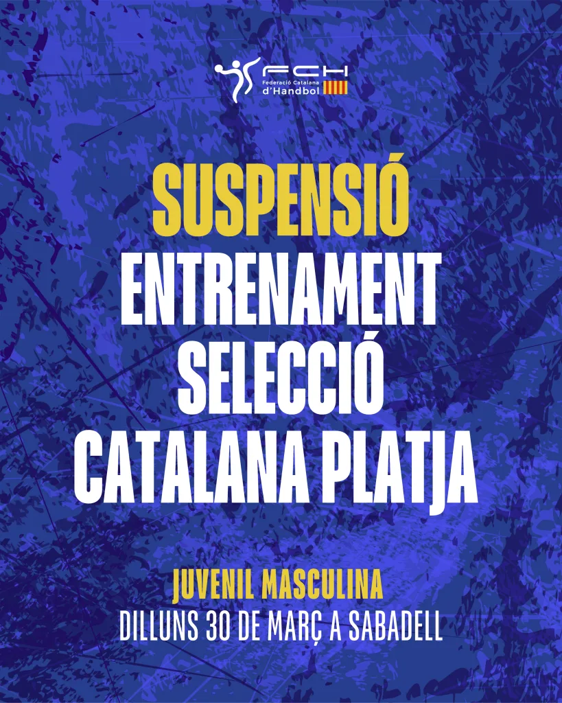 L’entrenament de la Selecció Catalana de Platja Juvenil Masculina, previst per al dilluns 30 de març de 2026 a Sabadell, ha quedat suspès. Des de la Federació Catalana d’Handbol es comunicarà properament qualsevol nova convocatòria o reprogramació de l’activitat. Gràcies per la vostra comprensió.